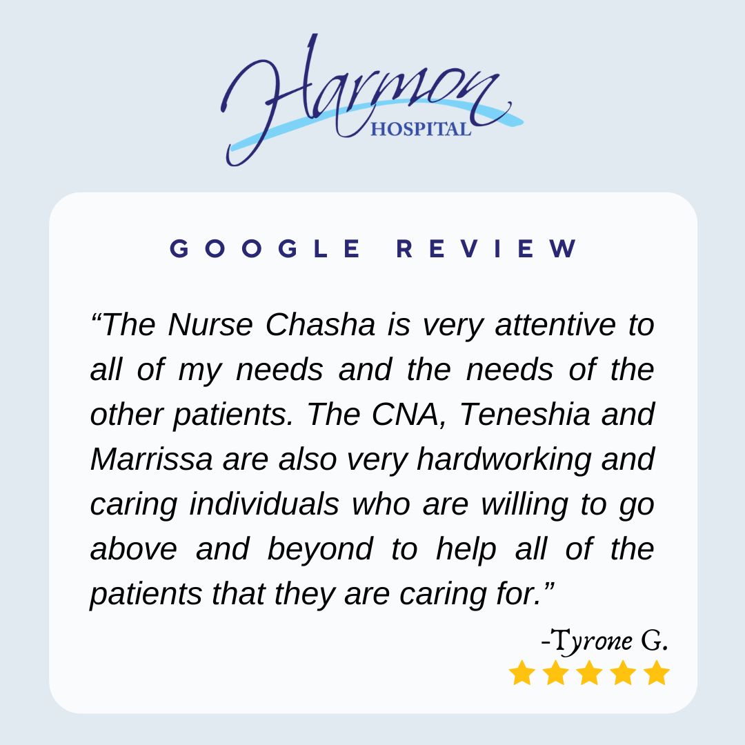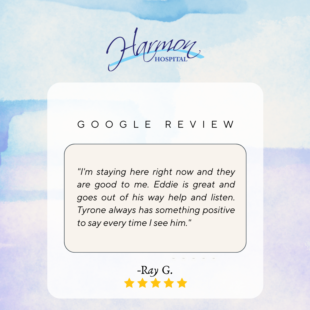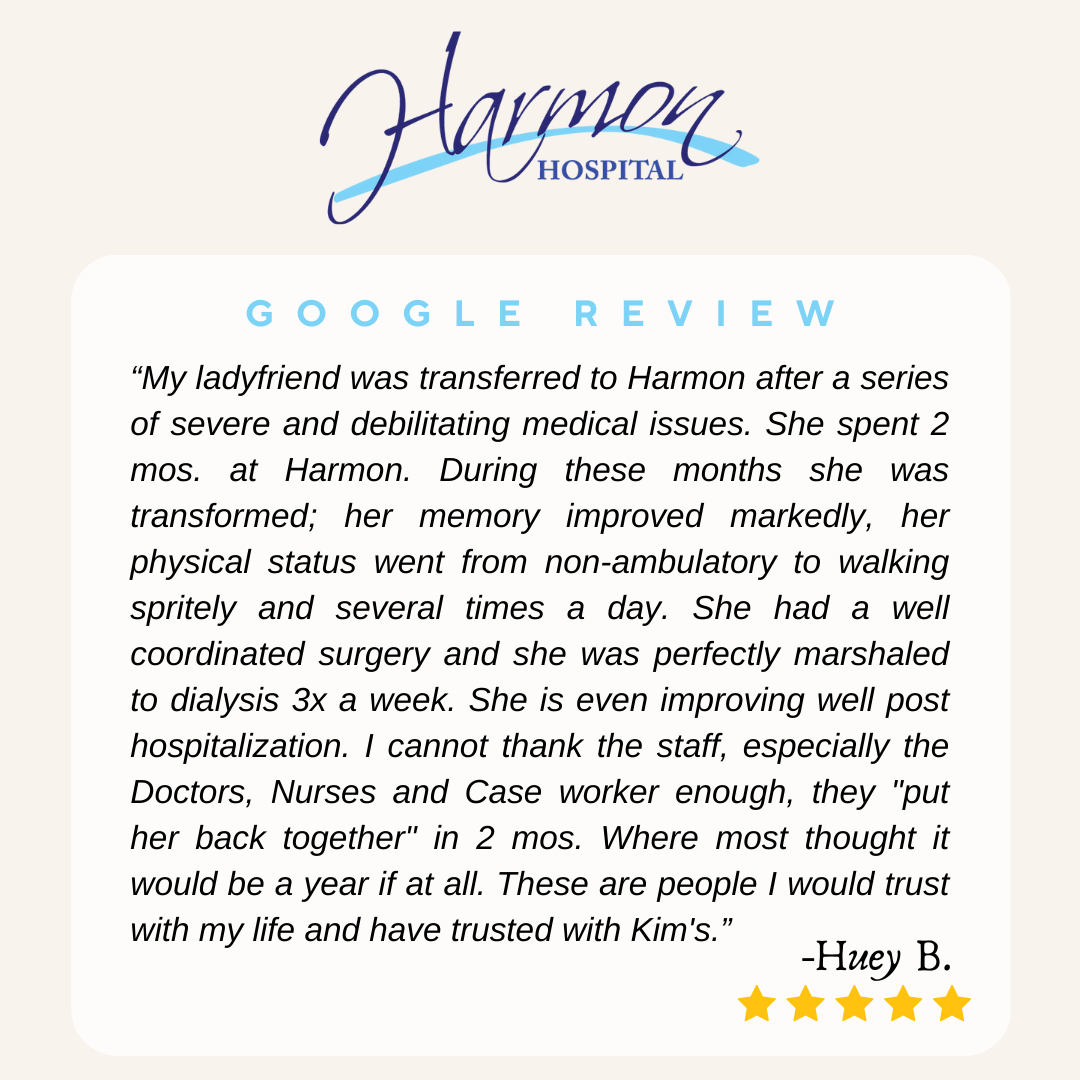 We believe that wellness is the result of comprehensive care and attention to service. At Harmon Hospital, we are committed to providing quality, compassionate and supportive care to our residents. Our professional staff, and the independent physicians and consultants at Harmon Hospital are all committed to working with our patients and residents as partners to meet their individual health care, rehabilitation and coordination needs. As care givers, we want to know our patients as individuals, taking care of their health needs, but also considering the person as a whole.