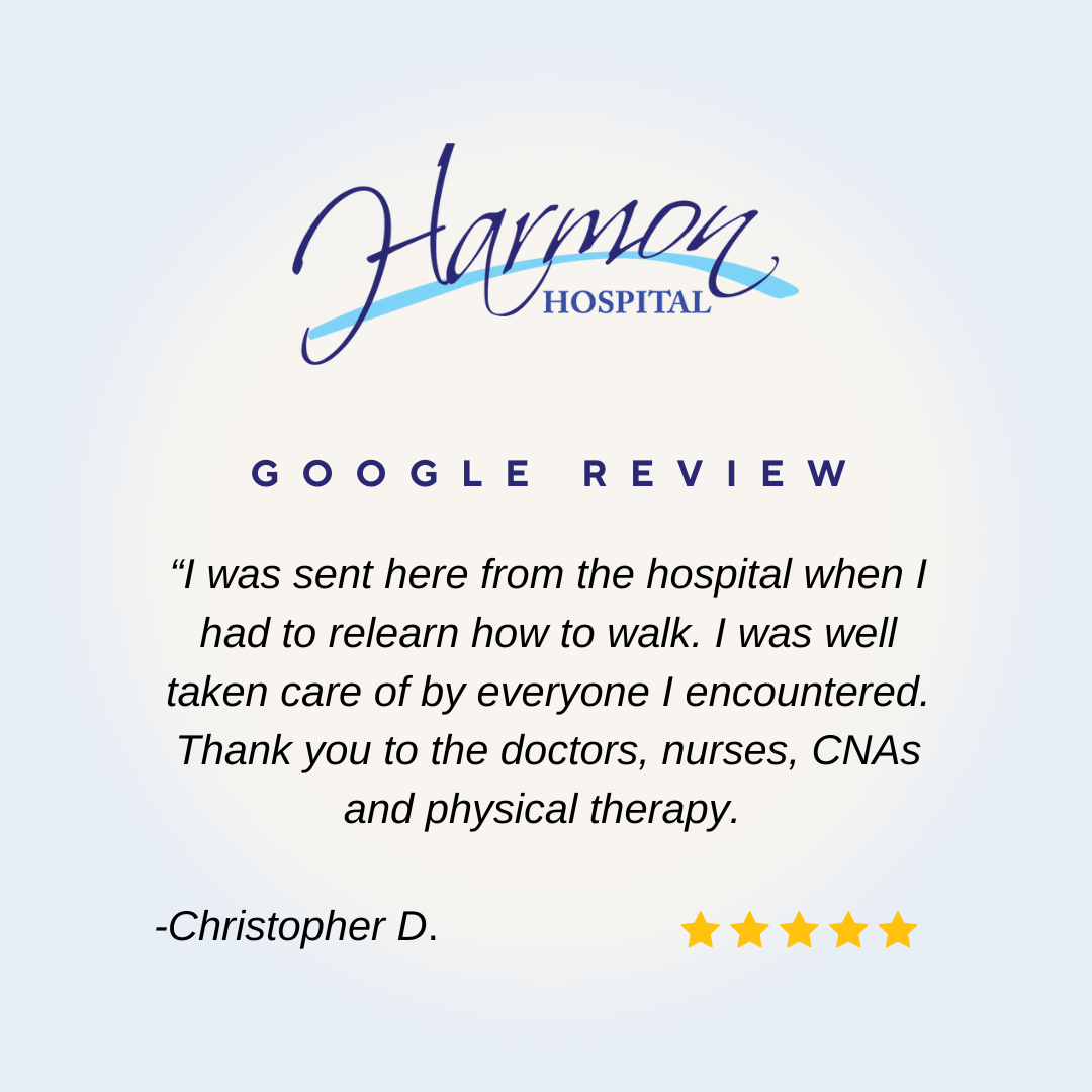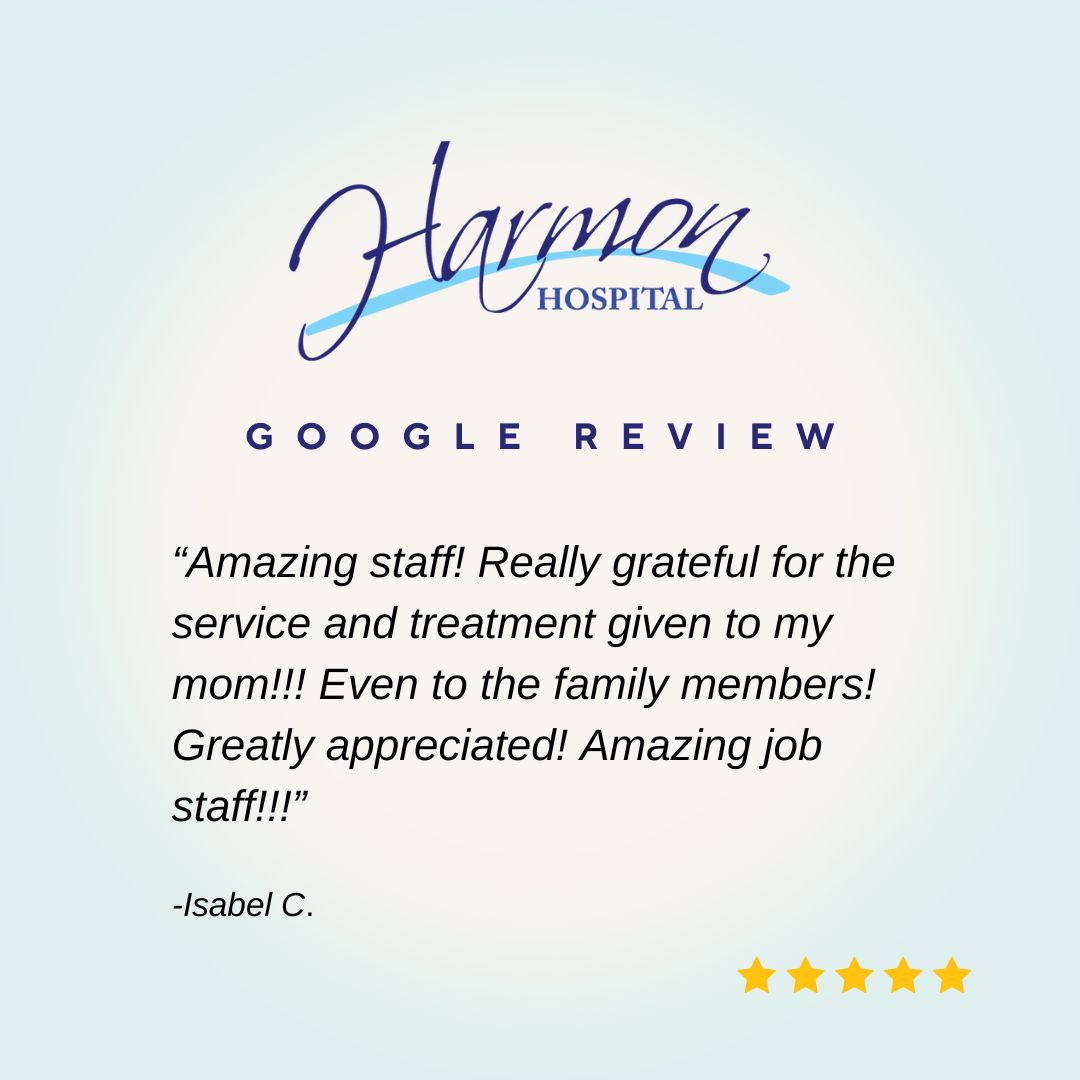 Harmon Hospital is proud of its history in the community and we treasure our relationships with residents and families. We strive to maximize and enhance the quality of life of our residents in a compassionate and professional environment. The need for long-term care, skilled nursing, or rehabilitation may not occur under ideal circumstances. A fall, stroke, or brief illness can deprive us of our customary feeling of independence and security. Fortunately, we have a team of trained professionals that will assist in developing individualized plans of care, in order to achieve desired goals.